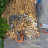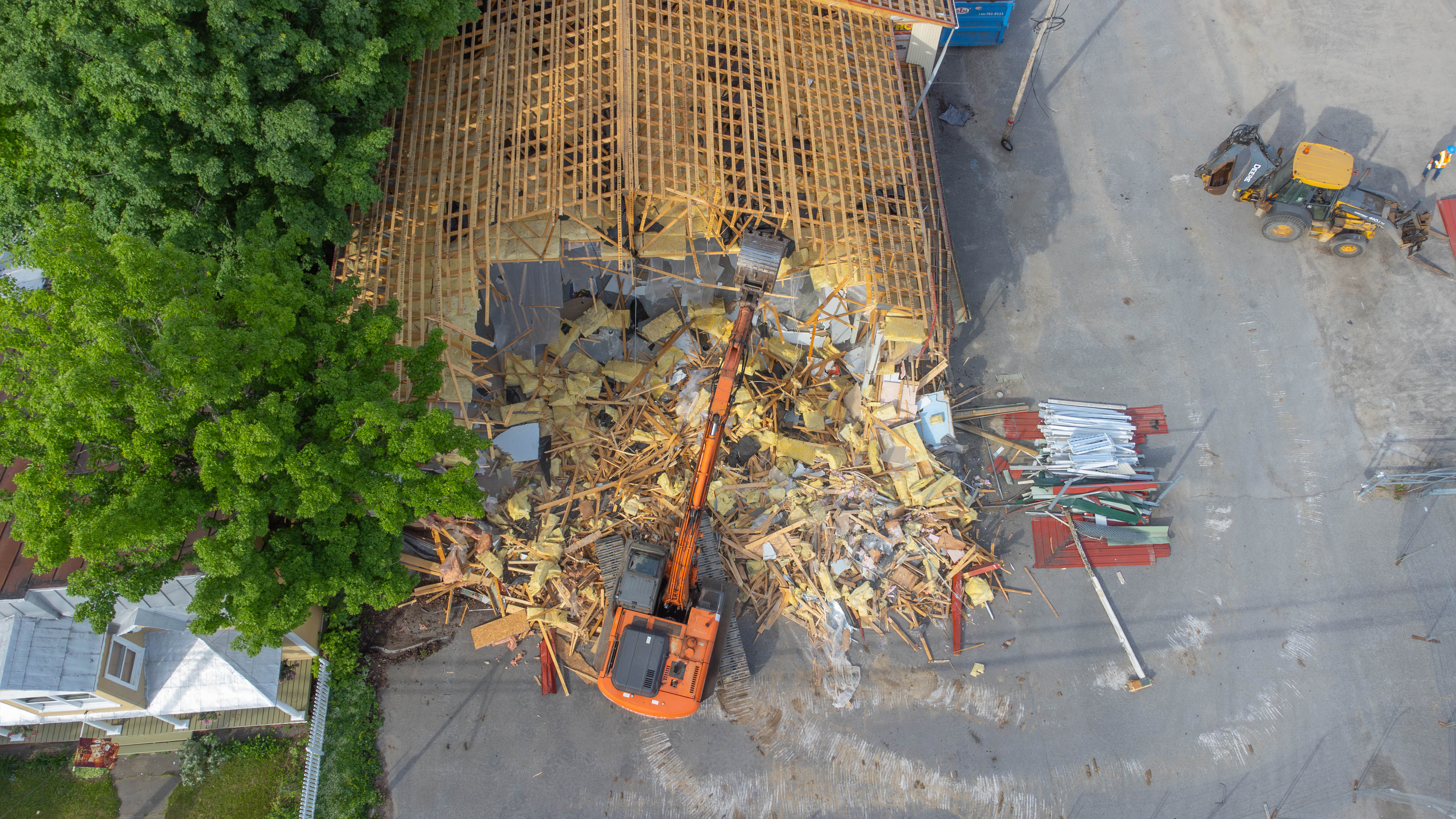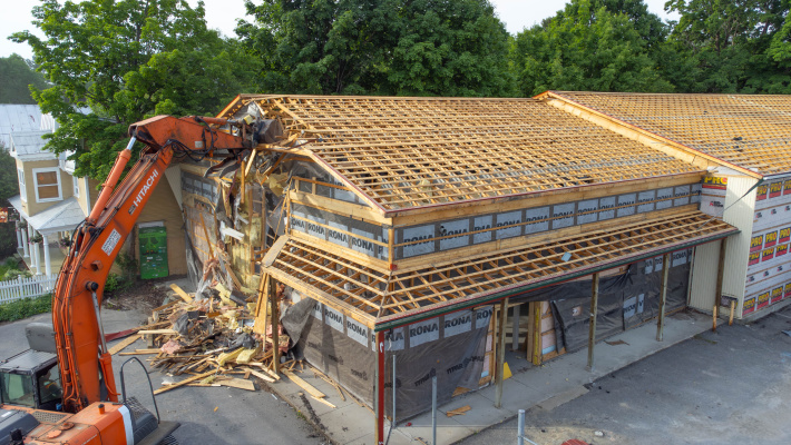 Déconstruction sélective de l’ancien bâtiment sur la rue Metcalfe. La Municipalité a priorisé la réutilisation et la récupération des matériaux de construction de façon responsable en les transportant et les disposant à l'Écocentre.