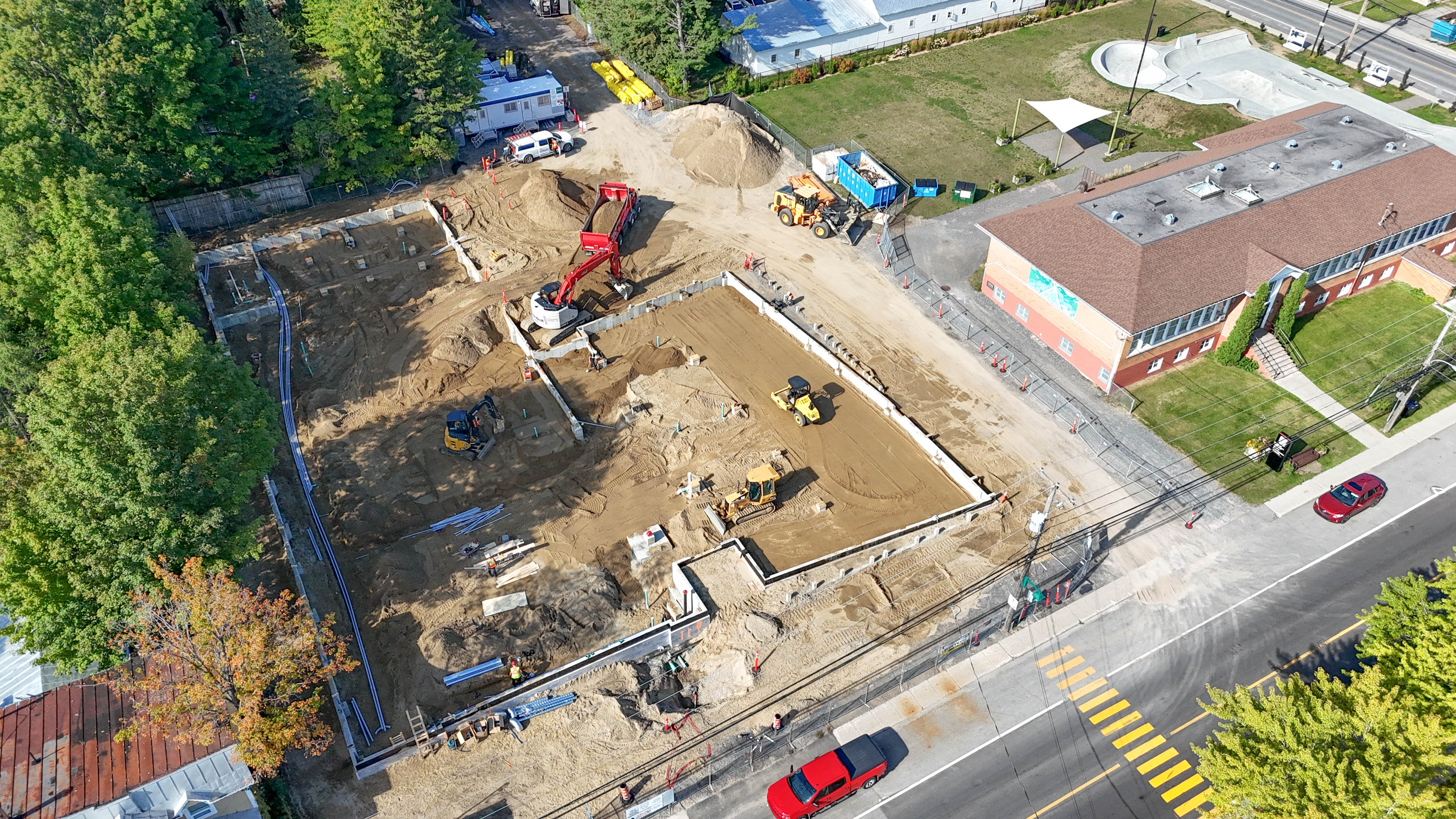 Construction du nouveau parc de planche à roulettes, qui représente la phase 1 du Quartier du citoyen. Le nouveau parc de planche à roulettes, du double de superficie que le précédent, aura de quoi réjouir les amateurs de sensations fortes et de tricks! Pour s’assurer de les satisfaire, rappelons que Rawdon a pris soin de consulter le comité d’usagers et la Maison des jeunes de Rawdon avant de conclure un plan d’aménagement unique, avec des tracés et des courbes qui feront rêver.